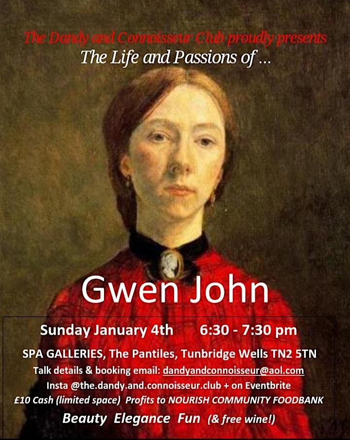 This month, Sunday January 4th (6:30 -7:30 pm), our third talk is entitled 'The Life and Passions of Gwen John' and will be given by Mr Beautifully So. Tickets are selling fast!...see contact details at the end of this message.