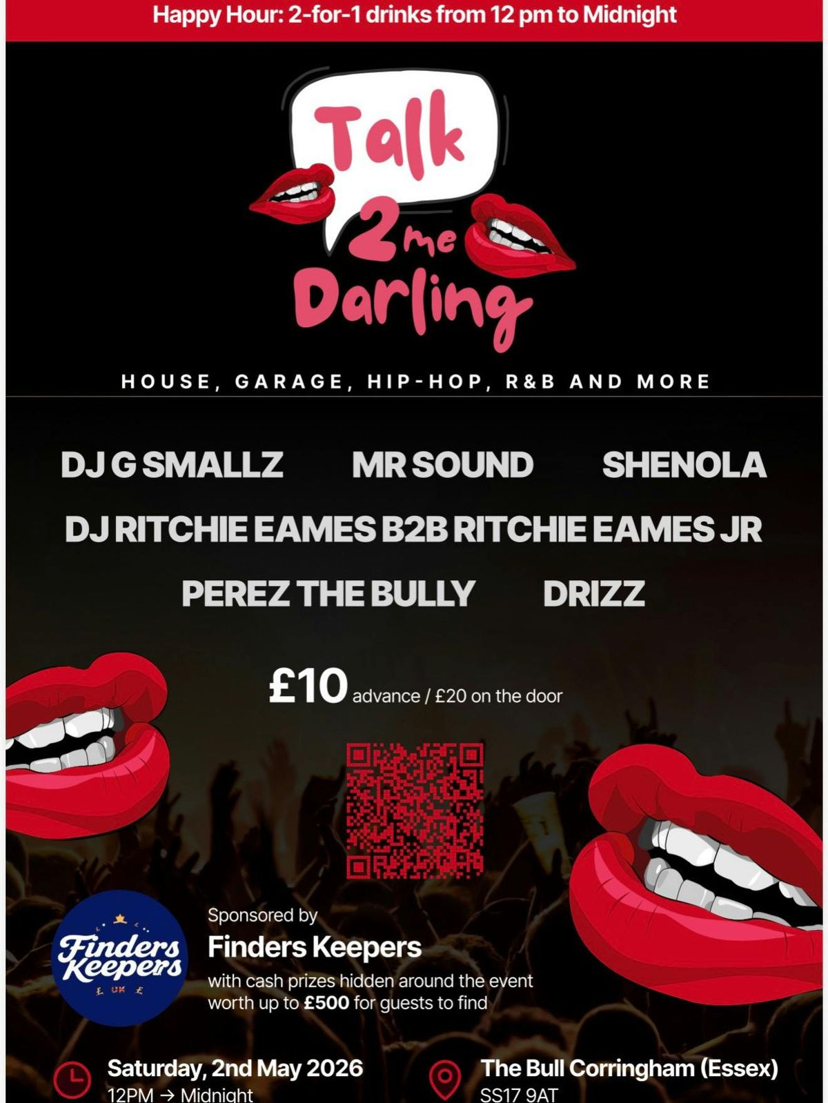 Darling, it’s time to let your hair down, sip something smooth, and dance like no one’s watching. On Saturday 2nd May 2026, we’re taking over The Bull in Corringham (SS17 9AT) for a day-to-night party that’s all about good music, good energy, and even better company.Start early and take full advantage of our 2-4-1 Happy Hour from 12PM -4PM 🍹 the perfect excuse to grab your bestie (or someone you’ve been eyeing 👀) and double up on the good vibes.