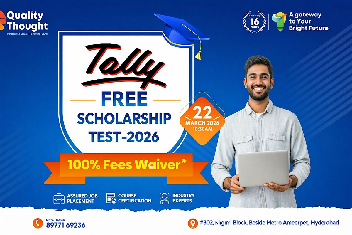 Hey there! Get ready for the Tally Mega Free Scholarship Test happening at Quality Thought on March 22, 2026 at 10:00 AM (IST). It's a great chance to showcase your skills and grab a scholarship without any cost. Don’t miss out on this awesome opportunity to boost your future. Come join us in person and give it your best shot!