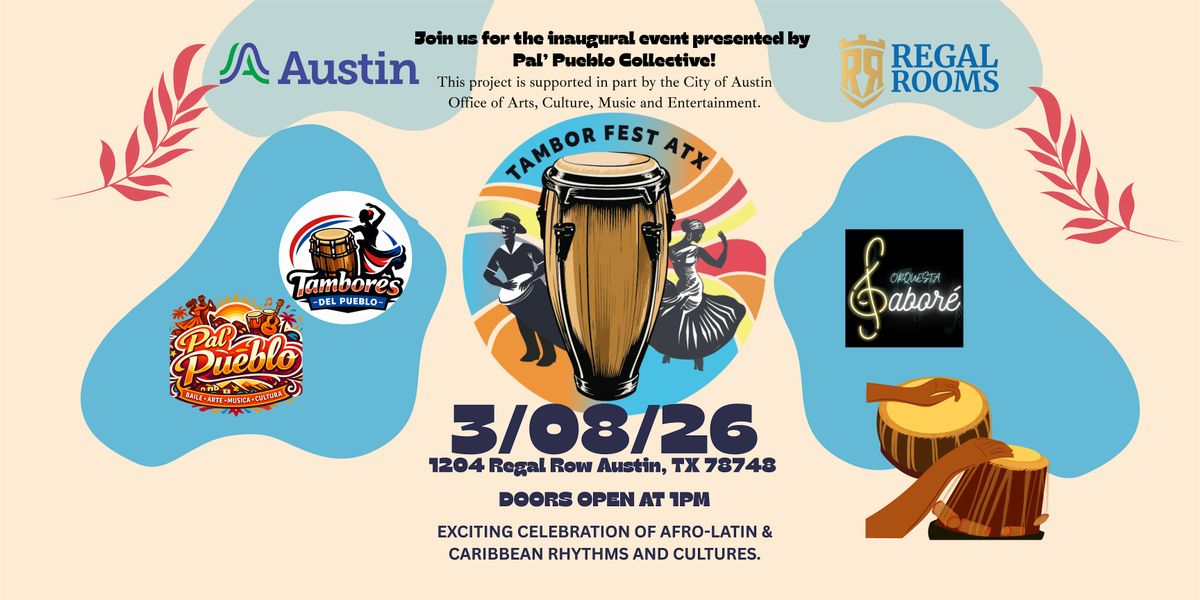Get ready to vibe with Tambor Fest ATX, a vibrant event celebrating the energy, food, dance, and music of Afro-Latin culture. Showcasing dance and music from Venezuela, Colombia, Cuba, and Puerto Rico! Enjoy live Salsa, Bomba, and Bullerengue with local bands. Get your dance shoes ready for all day fun!
