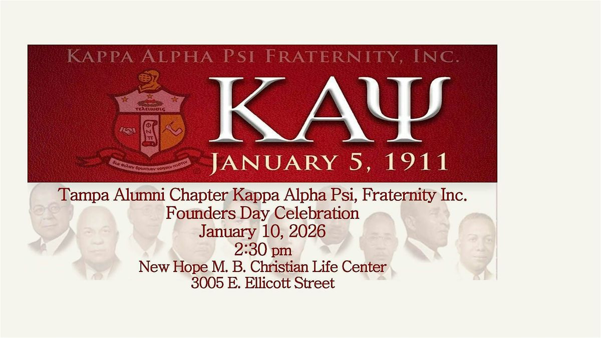 The Tampa Alumni Chapter Kappa Alpha Psi Fraternity, Inc. will celebrate Founder's Day on Saturday, January 10, 2026 at the New Hope Missionary Baptist Christian Life Center, located at 3005 E. Ellicott Street.