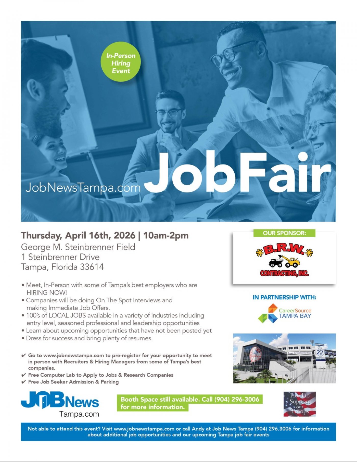 Job News Tampa, along with our SPONSOR - BRW Contracting, and in Partnership with CareerSource Tampa Bay will be hosting a Hiring Event from 10 am to 2 pm on Thursday April 16th, 2026 at George Steinbrenner Field located at One Steinbrenner Drive Tampa FL 33614