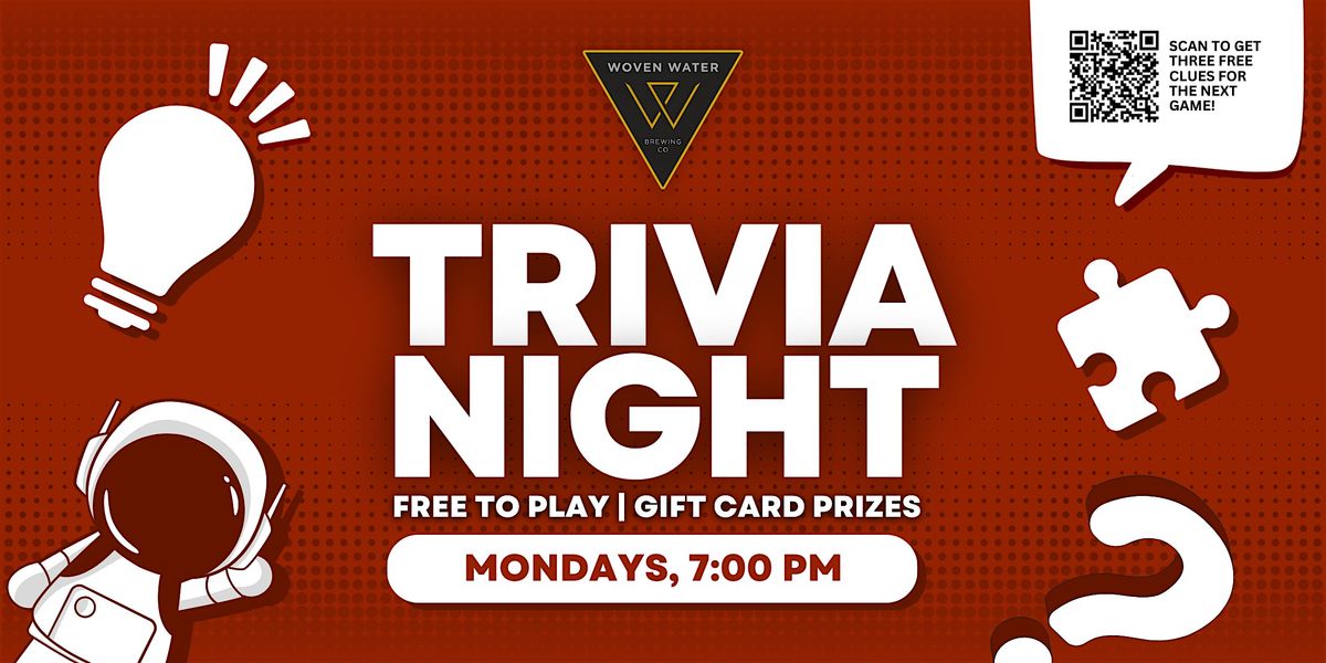 Join us for free live trivia every Monday at 7pm at Woven Water Brewing in Tampa, FL! Free to play, and top teams win gift card prizes!
