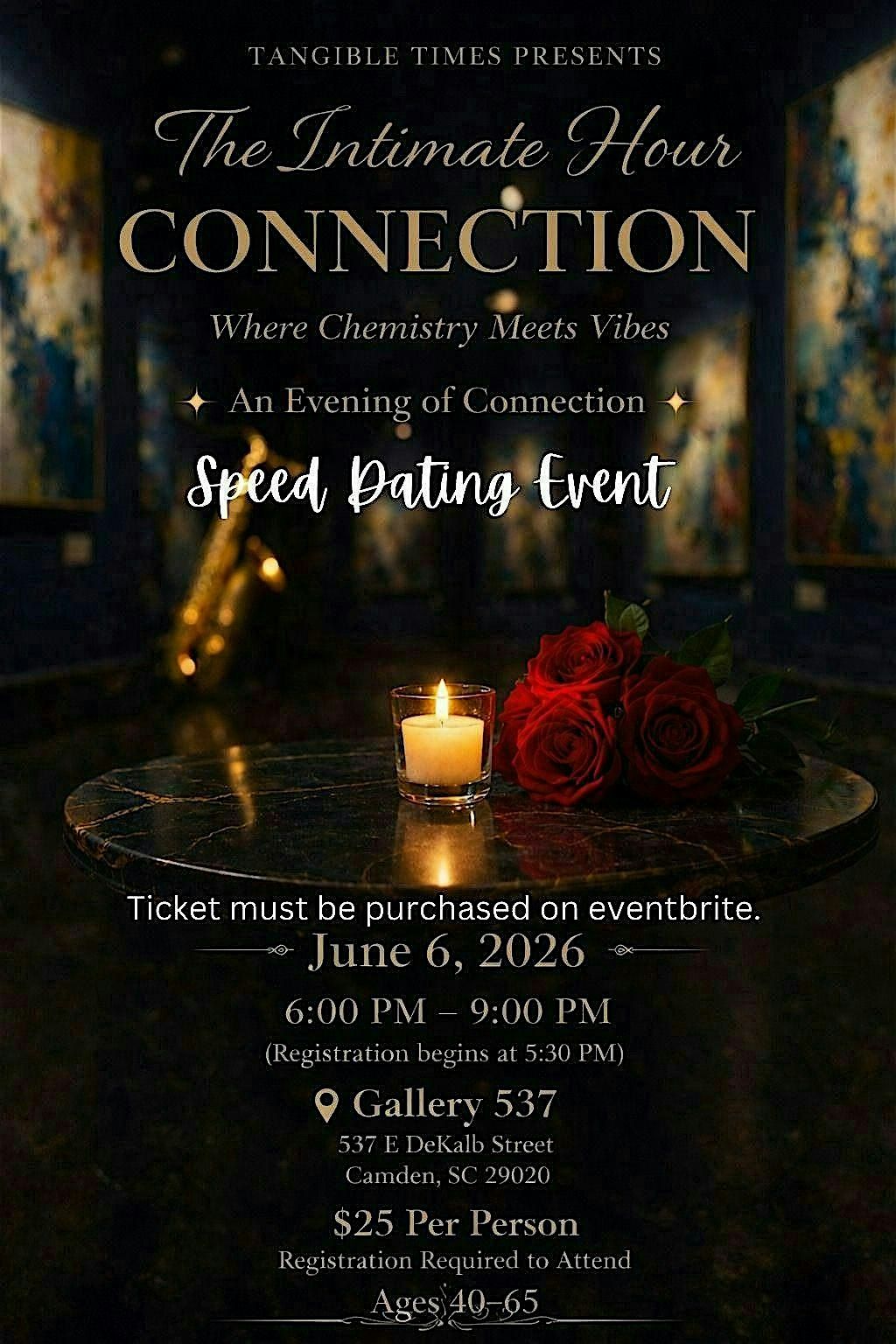 Single and between 40–65? Looking to meet your forever person—or just make a new connection with zero pressure? Join us at Gallery 537 on June 6, 2026. You might find a spark, or you might just click with someone in a different way—and that’s perfectly okay. Spots are limited, so grab your ticket(s) while they’re available. Tickets are non‑refundable. Have questions? Give us a call at 803‑310‑3434.