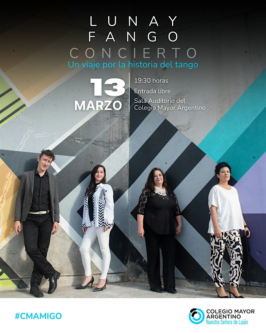 El reconocido Cuarteto de Tango de Cámara —integrado por Gabriela Maceira (voz), Paola Siervo (piano), Sandra Valdovinos (violín) y Matías Borinelli (clarinete)— llega al auditorio con un recorrido único por la historia del tango: clásicos, valses, milongas, candombes y la nueva vanguardia, todo con arreglos originales creados para esta formación. Ven a disfrutar de esta experiencia única: 📍 Auditorio del Colegio Mayor Argentino