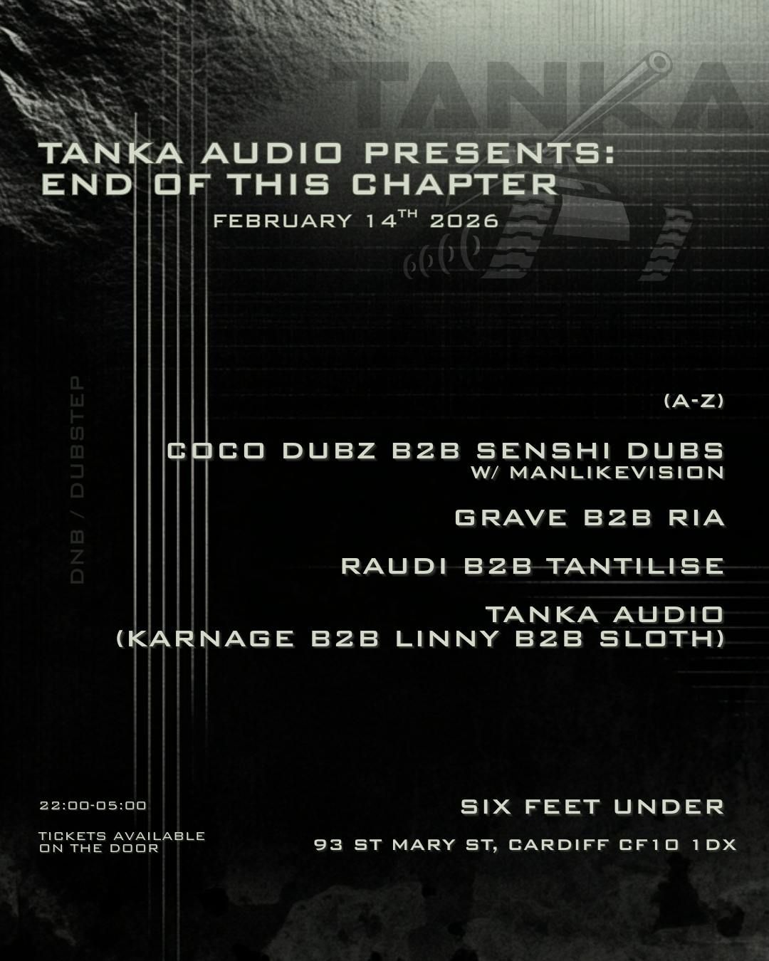 As we sadly say goodbye to Six Feet Under Cardiff, we wanted to see it off in real Tanka Audio fashion.A serious selection of locally sourced emerging talent, providing underground sonics from the drum & bass and uk dubstep / grime sectors2 hour Tanka Audio 140-178 set 🪖Feb 14th 2026 / Tickets just £5LINE-UP: