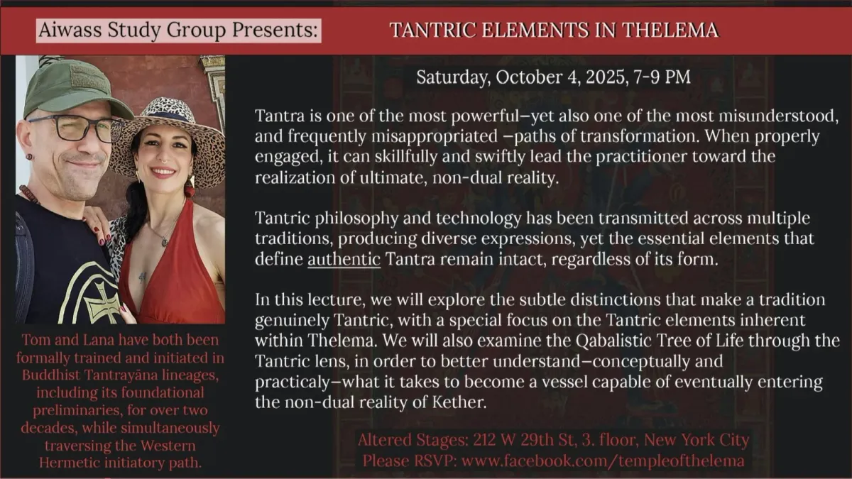 In this lecture, we will explore the subtle distinctions that make a tradition genuinely Tantric, with a special focus on the Tantric elements inherent within Thelema. We will also examine the Qabalistic Tree of Life through the Tantric lens, in order to better understand—conceptually and practicaly—what it takes to become a vessel capable of eventually entering the non-dual reality of Kether.