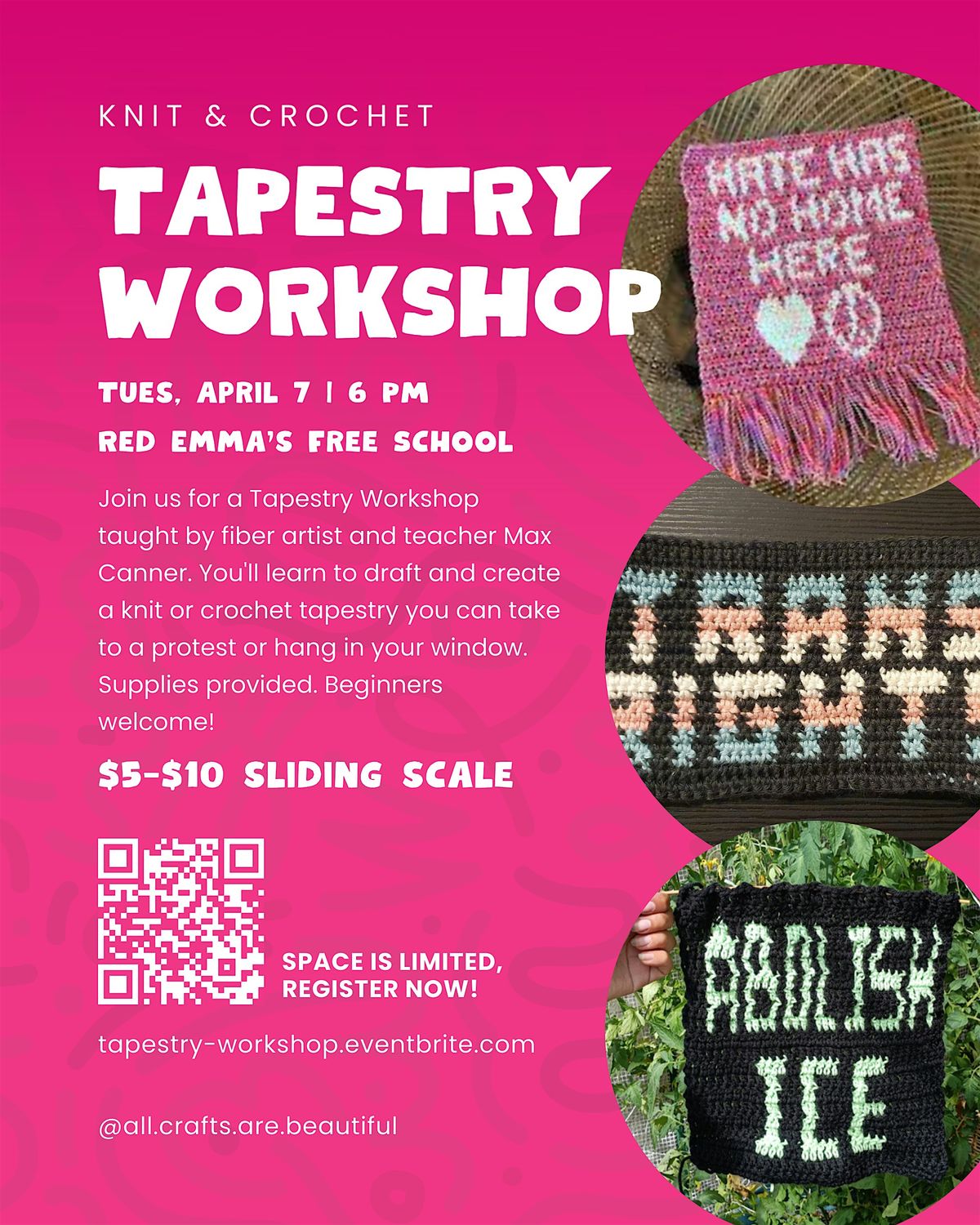Join us in the Red Emma's free school classroom for a Tapestry Workshop taught by fiber artist and teacher Max Canner. You'll learn to draft and create a knit or crochet tapestry you can take to a protest or hang in your window. Beginners welcome!
