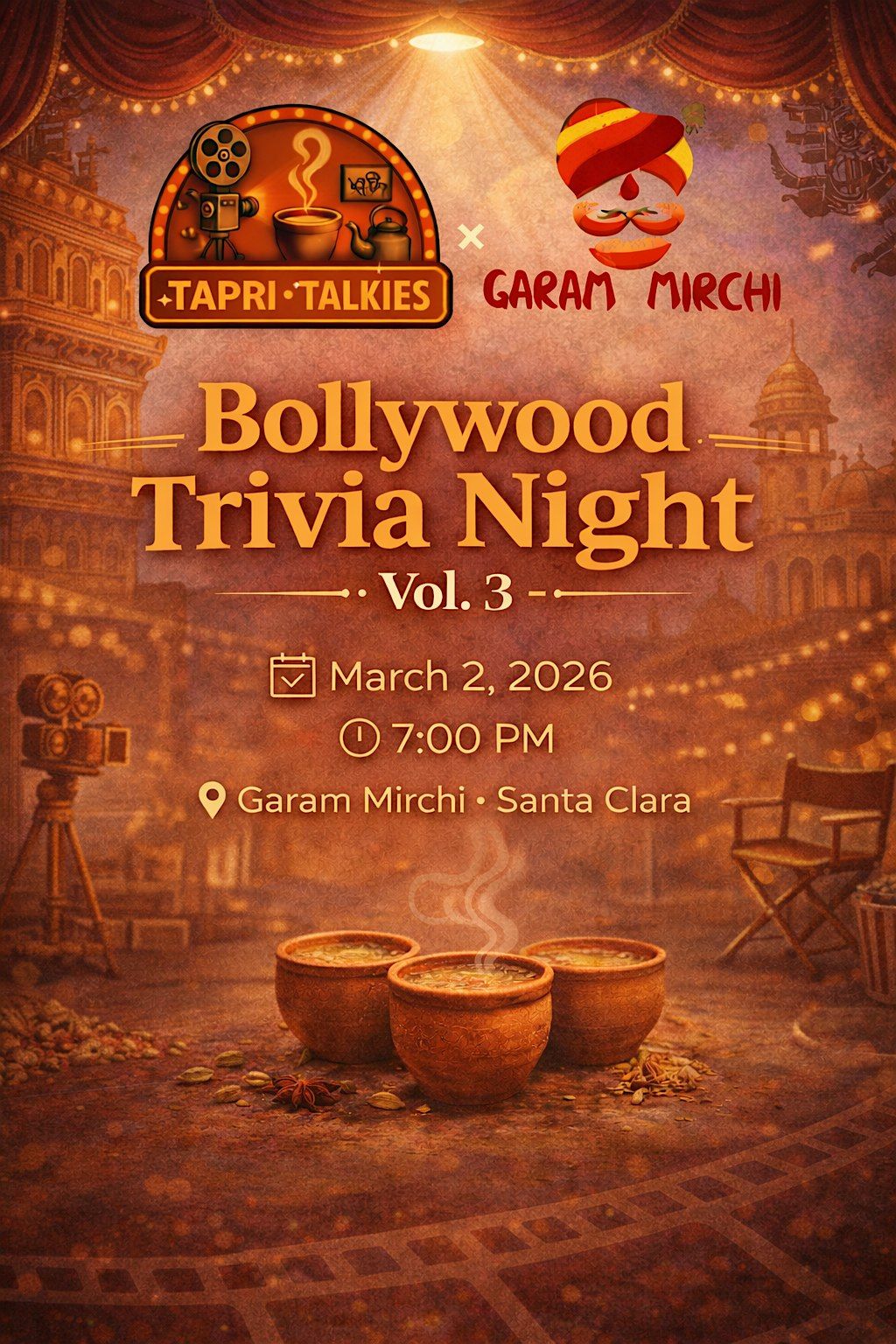 Get ready for an epic night of Bollywood fun and brain-teasing trivia! Join us in person for Tapri Talkies: Bollywood Trivia Night - Vol. 3, where you can test your movie knowledge, relive iconic moments, and compete with fellow Bollywood buffs. Whether you're a die-hard fan or just love a good quiz, this night is all about laughter, music, and filmi excitement. Don't miss out on the fun – bring your squad or come solo and let's see who's the ultimate Bollywood boss!