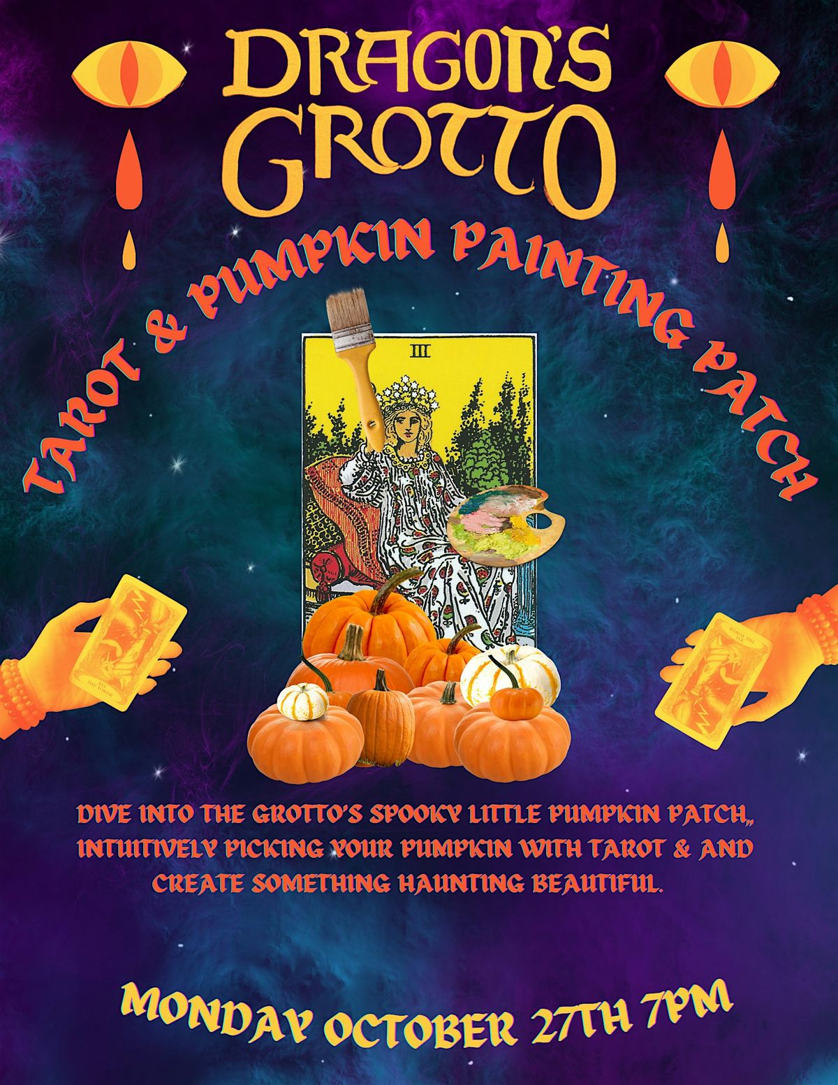 INSIDE THE GROTTO’S PUMPKIN PATCH YOU WILL CHOOSE YOUR PUMPKIN WITH TAROT—YOUR CARD GUIDING YOU TO YOUR PUMPKIN. TICKET INCLUDES PUMPKIN TO PAINT (SUPPLIES PROVIDED) A ONE-ON-ONE TAROT READING, LITE BITES & SPOOKY MOCKTAIL.