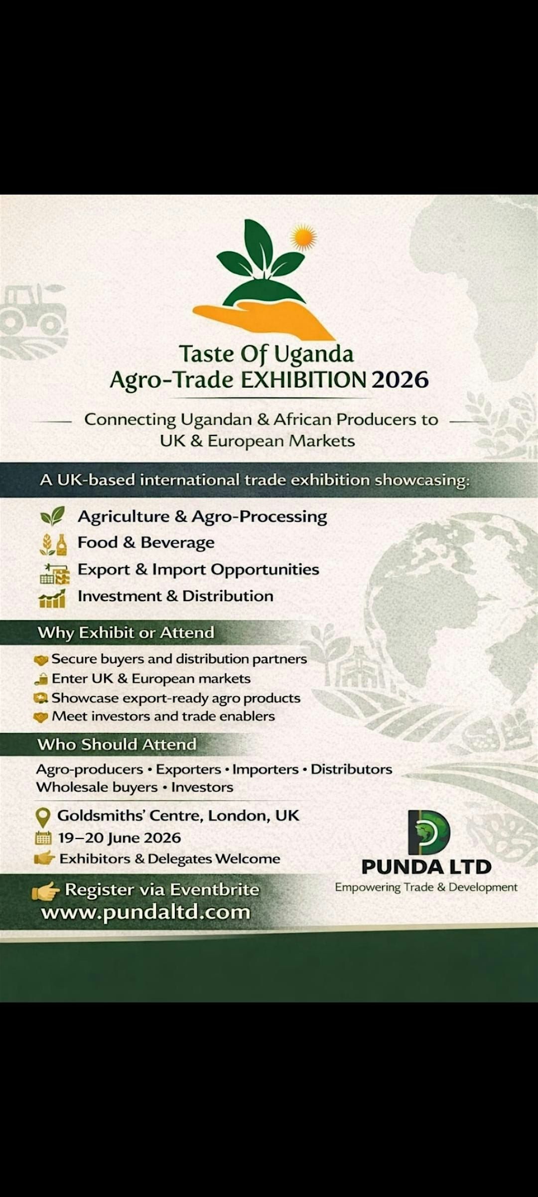 Taste of Uganda Agro-Trade Exhibition 2026 is a UK-based international trade exhibtion connecting Uganda and African producers with UK and European markets.