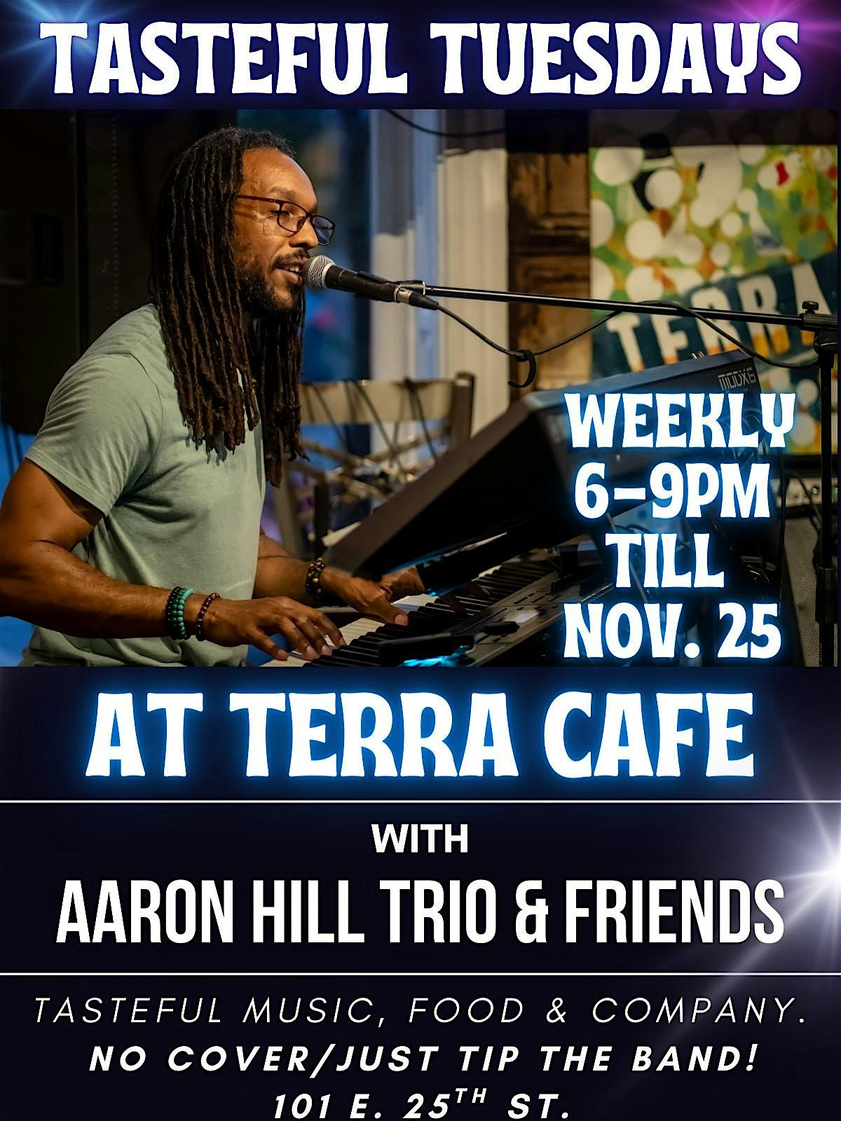 Welcome to Tasteful Tuesdays at Terra Cafe! Join us for a night of live music with the Aaron Hill Trio & Friends. Get ready to groove to some awesome music and enjoy a great atmosphere. Bring your friends and family for a fun evening out. Don't miss out on this fantastic event! NO COVER...JUST TIP THE BAND!