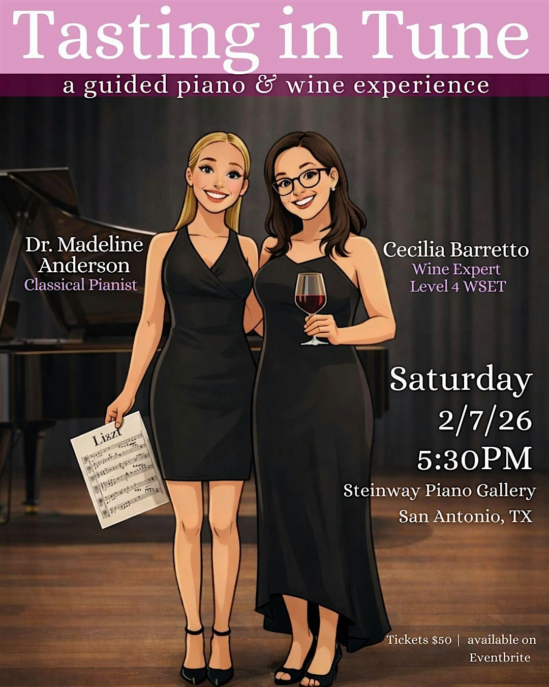 A guided listening and tasting experience with Dr. Madeline Anderson, pianist, and Cecilia Barretto, Wine Expert, WSET Level 4