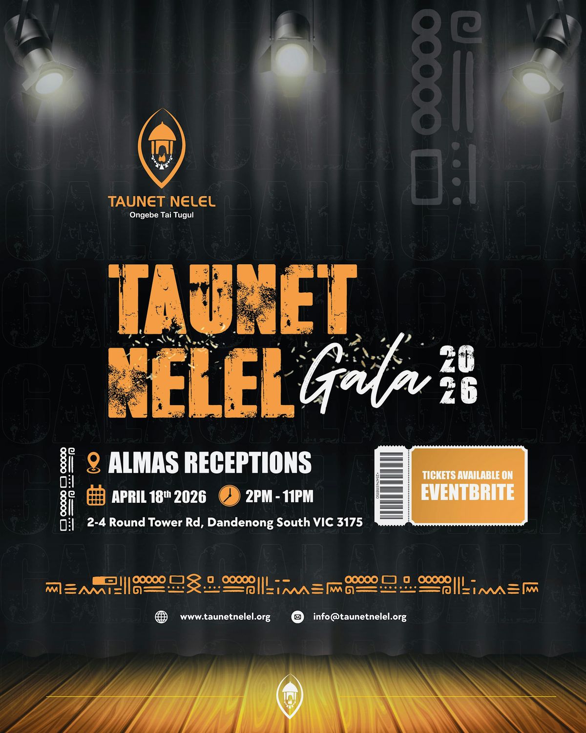 Welcome to the **TAUNET NELEL 2026 GALA** happening at **Almas Receptions** on April 18, 2026 at 2:00 PM (Australia/Melbourne time). Get ready for an evening filled with **music**, **dancing**, and **delicious food**. Join us for a night of celebration and fun with friends and family. Don't miss out on this special event!