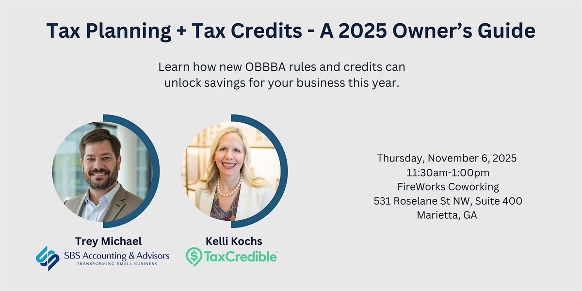 Join us on November 6 in Marietta, Georgia, for this in-person event. Trey Michael, CPA, of SBS Accounting & Advisors and Kelli Kochs of TaxCredible will share valuable insight to help you balance the competing demands for your business capital.