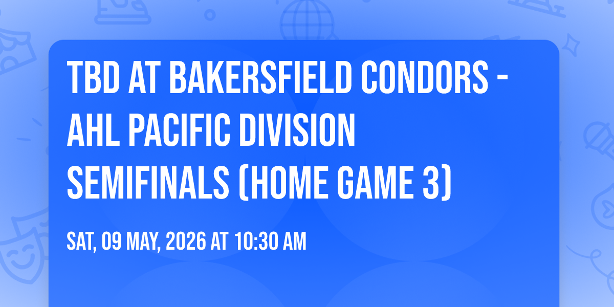 📍 Location: 35.3722, -119.013🎉 Prepare to be amazed at TBD at Bakersfield Condors - AHL Pacific Division Semifinals (Home Game 3), the most anticipated gathering of the season! 🌟 Set against the stunning backdrop of Dignity Health Arena in vibrant Bakersfield, CA, this event promises to redefine your expectations. 📅 Mark your calendars for May 9th, 2026 at 10:30 AM and get ready to immerse yourself in an atmosphere of wonder and excitement. ✨ From the moment you arrive, you'll be transported into a world where memories are made and stories come alive. They have crafted an experience that perfectly harmonizes entertainment, innovation, and community spirit. 🌈 Join us as we create moments that will be discussed for years!