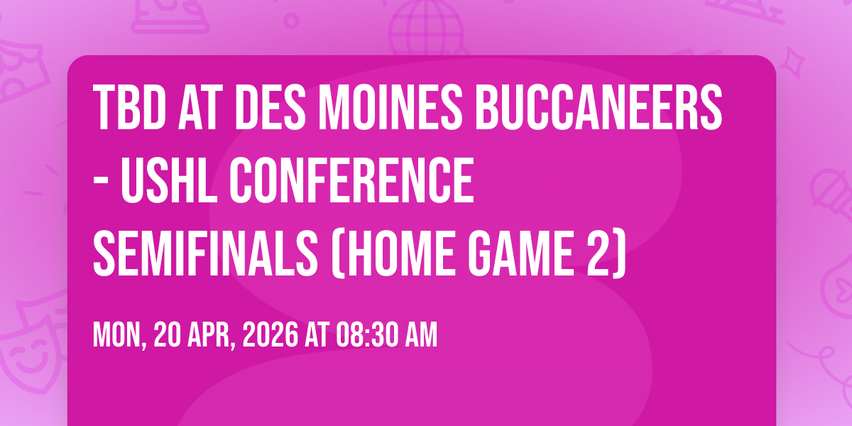 π Location: 41.539093, -93.79931π Step into a world of wonder at TBD at Des Moines Buccaneers - USHL Conference Semifinals (Home Game 2), where extraordinary moments await! ποΈ Located at The MidAmerican Energy Company RecPlex in dynamic West Des Moines, IA, this event will become the talk of the town. π Join us on April 20th, 2026 at 08:30 AM for a celebration that defies the ordinary. β¨ This curated experience brings together the best of entertainment, culture, and community spirit. Every detail has been thoughtfully planned to ensure an unforgettable experience for all our guests. π― Take advantage of this opportunity to be part of something special. π Early registration is recommended as space is limited!