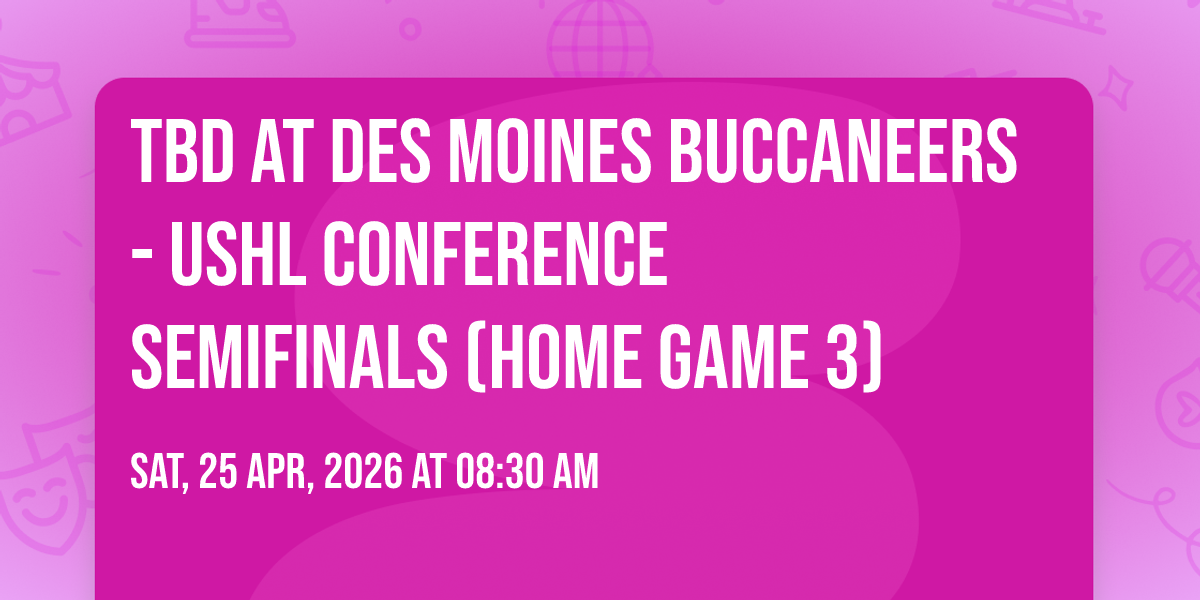 π Location: 41.539093, -93.79931π Step into a world of wonder at TBD at Des Moines Buccaneers - USHL Conference Semifinals (Home Game 3), where extraordinary moments await! ποΈ Located at The MidAmerican Energy Company RecPlex in dynamic West Des Moines, IA, this event will become the talk of the town. π Join us on April 25th, 2026 at 08:30 AM for a celebration that defies the ordinary. β¨ This curated experience brings together the best of entertainment, culture, and community spirit. Every detail has been thoughtfully planned to ensure an unforgettable experience for all our guests. π― Take advantage of this opportunity to be part of something special. π Early registration is recommended as space is limited!