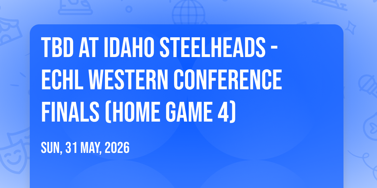 π Location: 43.6146, -116.204π Welcome to TBD at Idaho Steelheads - ECHL Western Conference Finals (Home Game 4), where the impossible becomes possible and dreams take flight! ποΈ Join us at Idaho Central Arena in the heart of Boise, ID for an event that will redefine your expectations. π On May 31st, 2026 at 09:30 AM, witness the transformation of space and time into something truly magical. β¨ It's a curated experience combining the best of innovation, entertainment, and community spirit, creating moments that will be remembered for years to come. Whether you're a first-time visitor or a seasoned enthusiast, prepare to be amazed. π Book now to ensure your place in this unforgettable experience!