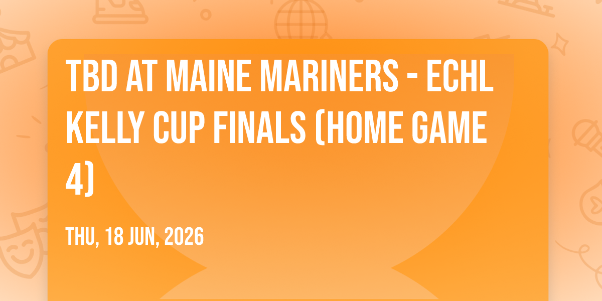 π Location: 43.6559, -70.2585β¨ Experience the magic of TBD at Maine Mariners - ECHL Kelly Cup Finals (Home Game 4), where moments become memories that last a lifetime! ποΈ The iconic Cross Insurance Arena in Portland, ME sets the perfect stage for an unforgettable celebration on June 18th, 2026 at 07:30 AM. π It's been a curated experience that brings together the best of entertainment and innovation, creating an atmosphere of wonder and excitement. From the moment you arrive, you'll be immersed in a world where the ordinary transforms into the extraordinary. π Book early to secure your place in what promises to be an event that will be talked about for years to come!