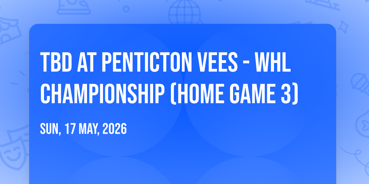 π Location: 49.4948, -119.606π Be part of history at TBD at Penticton Vees - WHL Championship (Home Game 3), an extraordinary gathering that will captivate your imagination! ποΈ The prestigious South Okanagan Events Centre in Penticton, BC sets the stage for an unforgettable experience on May 17th, 2026 at 10:30 AM. β¨ They are bringing together the finest elements of entertainment and innovation to create moments that will take your breath away. From the moment you arrive, you'll be immersed in an atmosphere of wonder and excitement. π― This carefully planned event ensures every guest experiences something truly special. π Early booking is recommended for this must-attend event of the season!