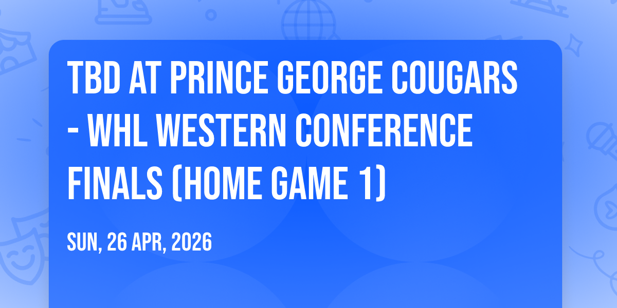 π Location: 53.9069, -122.798β¨ Enter a world of endless possibilities at TBD at Prince George Cougars - WHL Western Conference Finals (Home Game 1), where every moment tells a story! ποΈ The stunning CN Centre in vibrant Prince George, BC transforms into a realm of wonder on April 26th, 2026 at 10:30 AM. π They have crafted an experience that goes beyond the ordinary, combining elements of surprise, delight, and pure entertainment. Every detail has been thoughtfully considered to ensure your journey with us is nothing short of extraordinary. π― Join fellow adventure seekers and memory makers in this celebration of imagination and innovation. π Reserve your spot today and be part of something truly special!