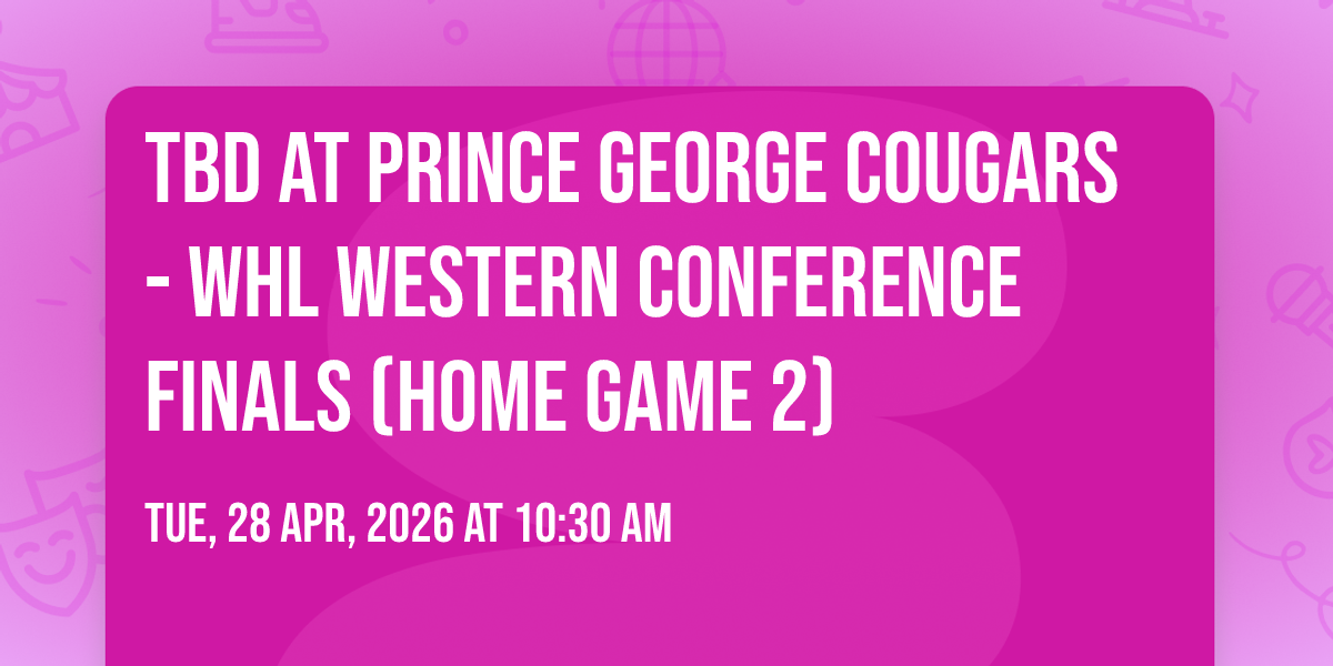 π Location: 53.9069, -122.798π Welcome to TBD at Prince George Cougars - WHL Western Conference Finals (Home Game 2), where the impossible becomes possible and dreams take flight! ποΈ Join us at CN Centre in the heart of Prince George, BC for an event that will redefine your expectations. π On April 28th, 2026 at 10:30 AM, witness the transformation of space and time into something truly magical. β¨ It's a curated experience combining the best of innovation, entertainment, and community spirit, creating moments that will be remembered for years to come. Whether you're a first-time visitor or a seasoned enthusiast, prepare to be amazed. π Book now to ensure your place in this unforgettable experience!