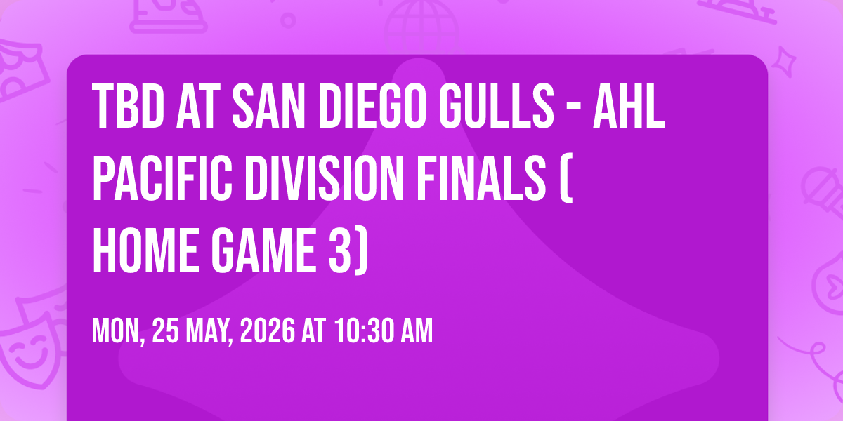 π Location: 32.7553, -117.212π Be part of history at TBD at San Diego Gulls - AHL Pacific Division Finals (Home Game 3), an extraordinary gathering that will captivate your imagination! ποΈ The prestigious Pechanga Arena San Diego in San Diego, CA sets the stage for an unforgettable experience on May 25th, 2026 at 10:30 AM. β¨ They are bringing together the finest elements of entertainment and innovation to create moments that will take your breath away. From the moment you arrive, you'll be immersed in an atmosphere of wonder and excitement. π― This carefully planned event ensures every guest experiences something truly special. π Early booking is recommended for this must-attend event of the season!