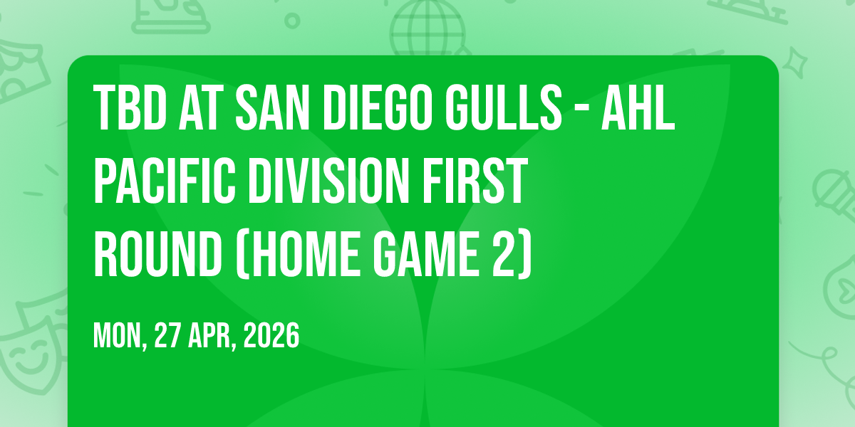 📍 Location: 32.7553, -117.212🌟 Be part of history at TBD at San Diego Gulls - AHL Pacific Division First Round (Home Game 2), an extraordinary gathering that will captivate your imagination! 🏛️ The prestigious Pechanga Arena San Diego in San Diego, CA sets the stage for an unforgettable experience on April 27th, 2026 at 10:30 AM. ✨ They are bringing together the finest elements of entertainment and innovation to create moments that will take your breath away. From the moment you arrive, you'll be immersed in an atmosphere of wonder and excitement. 🎯 This carefully planned event ensures every guest experiences something truly special. 🎊 Early booking is recommended for this must-attend event of the season!