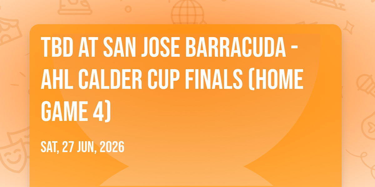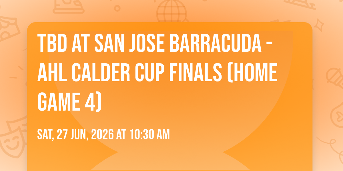 📍 Location: 37.3184, -121.863🎉 Welcome to TBD at San Jose Barracuda - AHL Calder Cup Finals (Home Game 4), where the impossible becomes possible and dreams take flight! 🏛️ Join us at Tech CU Arena in the heart of San Jose, CA for an event that will redefine your expectations. 📅 On June 27th, 2026 at 10:30 AM, witness the transformation of space and time into something truly magical. ✨ It's a curated experience combining the best of innovation, entertainment, and community spirit, creating moments that will be remembered for years to come. Whether you're a first-time visitor or a seasoned enthusiast, prepare to be amazed. 🎊 Book now to ensure your place in this unforgettable experience!