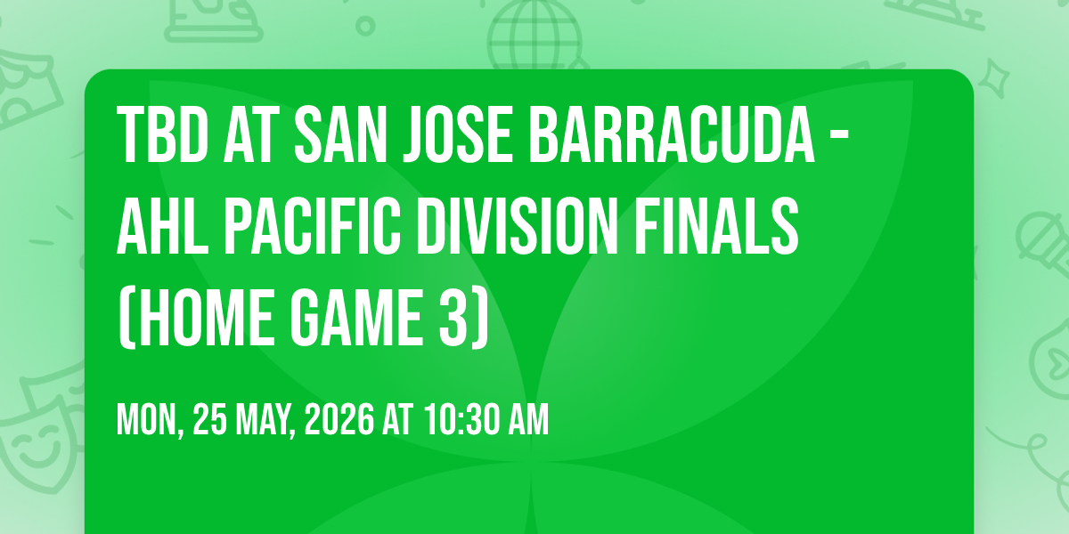 ๐ Location: 37.3184, -121.863๐ Be part of history at TBD at San Jose Barracuda - AHL Pacific Division Finals (Home Game 3), an extraordinary gathering that will captivate your imagination! ๐๏ธ The prestigious Tech CU Arena in San Jose, CA sets the stage for an unforgettable experience on May 25th, 2026 at 10:30 AM. โจ They are bringing together the finest elements of entertainment and innovation to create moments that will take your breath away. From the moment you arrive, you'll be immersed in an atmosphere of wonder and excitement. ๐ฏ This carefully planned event ensures every guest experiences something truly special. ๐ Early booking is recommended for this must-attend event of the season!