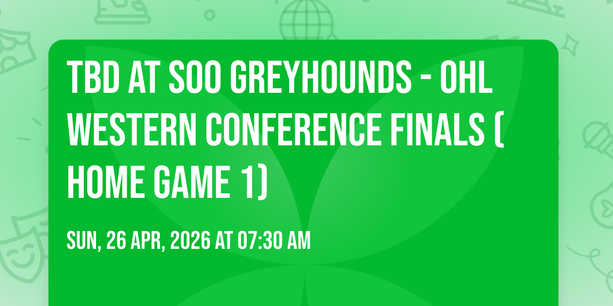 📍 Location: 46.5135, -84.337🎉 Welcome to TBD at Soo Greyhounds - OHL Western Conference Finals (Home Game 1), where the impossible becomes possible and dreams take flight! 🏛️ Join us at GFL Memorial Gardens in the heart of Sault Ste. Marie, ON for an event that will redefine your expectations. 📅 On April 26th, 2026 at 07:30 AM, witness the transformation of space and time into something truly magical. ✨ It's a curated experience combining the best of innovation, entertainment, and community spirit, creating moments that will be remembered for years to come. Whether you're a first-time visitor or a seasoned enthusiast, prepare to be amazed. 🎊 Book now to ensure your place in this unforgettable experience!