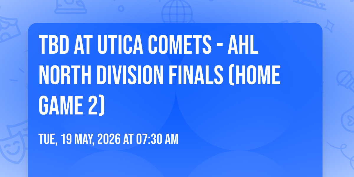 π Location: 43.1049, -75.2334β¨ Discover the extraordinary at TBD at Utica Comets - AHL North Division Finals (Home Game 2), where magic meets reality in ways you've never imagined! ποΈ Set in Adirondack Bank Center nestled in bustling Utica, NY, this event promises to be a landmark occasion. π Taking place on May 19th, 2026 at 07:30 AM, it's going to create an atmosphere where every moment becomes a cherished memory. π Immerse yourself in an experience crafted with attention to every detail, designed to surprise and delight at every turn. They have worked tirelessly to ensure this event exceeds all expectations, bringing together elements of entertainment, innovation, and pure joy. π Don't miss your chance to be part of this remarkable journey!
