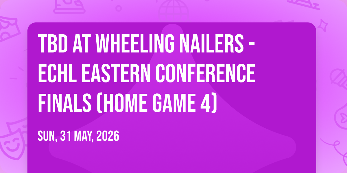 π Location: 40.066, -80.7179π Prepare to be amazed at TBD at Wheeling Nailers - ECHL Eastern Conference Finals (Home Game 4), the most anticipated gathering of the season! π Set against the stunning backdrop of Wesbanco Arena in vibrant Wheeling, WV, this event promises to redefine your expectations. π Mark your calendars for May 31st, 2026 at 07:30 AM and get ready to immerse yourself in an atmosphere of wonder and excitement. β¨ From the moment you arrive, you'll be transported into a world where memories are made and stories come alive. They have crafted an experience that perfectly harmonizes entertainment, innovation, and community spirit. π Join us as we create moments that will be discussed for years!