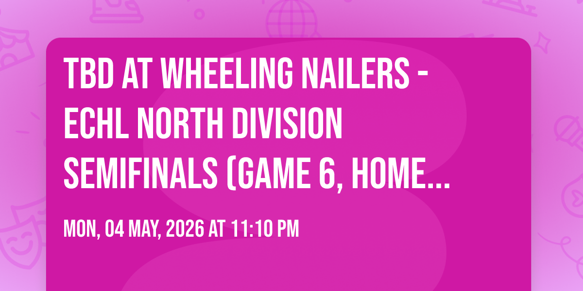 π Location: 40.066, -80.7179π Welcome to TBD at Wheeling Nailers - ECHL North Division Semifinals (Game 6, Home Game 3), where dreams come alive and possibilities are endless! ποΈ Join us at Wesbanco Arena in the heart of Wheeling, WV for an event that defies expectations. π On May 4th, 2026 at 11:10 PM, be part of something truly extraordinary as we bring together innovation, entertainment, and pure magic. β¨ Every aspect has been carefully designed to ensure an unforgettable experience for all our guests. Whether you're seeking adventure, inspiration, or simply a break from the ordinary, this event promises to deliver beyond your wildest dreams. π Prepare for a journey into the extraordinary!