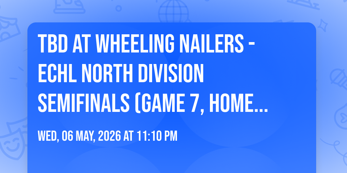 π Location: 40.066, -80.7179π Welcome to TBD at Wheeling Nailers - ECHL North Division Semifinals (Game 7, Home Game 4), where dreams come alive and possibilities are endless! ποΈ Join us at Wesbanco Arena in the heart of Wheeling, WV for an event that defies expectations. π On May 6th, 2026 at 11:10 PM, be part of something truly extraordinary as we bring together innovation, entertainment, and pure magic. β¨ Every aspect has been carefully designed to ensure an unforgettable experience for all our guests. Whether you're seeking adventure, inspiration, or simply a break from the ordinary, this event promises to deliver beyond your wildest dreams. π Prepare for a journey into the extraordinary!