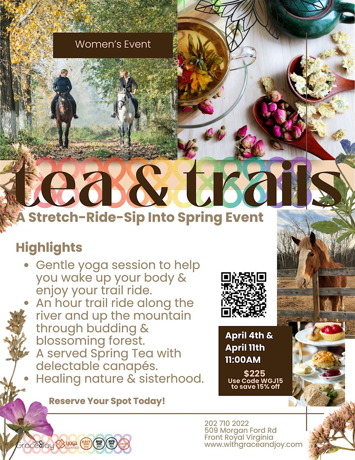 Tailored yoga & stretching. Private 1-hour horseback ride. Three-course afternoon tea — curated, paired, served with intention.