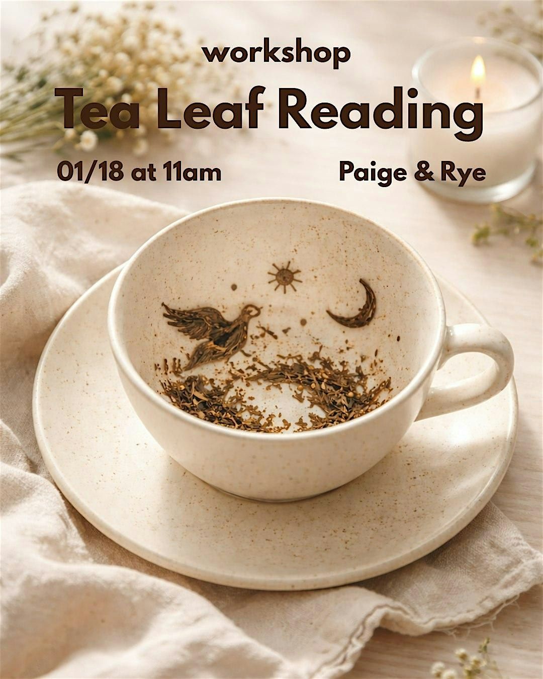 This Tea Leaf Reading workshop is an intimate, sensory experience that blends storytelling, intuition, and the ancient art of tasseography. Together, we slow down, sip intentionally, and learn how symbols left in the cup can reflect patterns, insights, and gentle guidance for the path ahead. This workshop is not about predicting the future — it’s about learning how to listen.