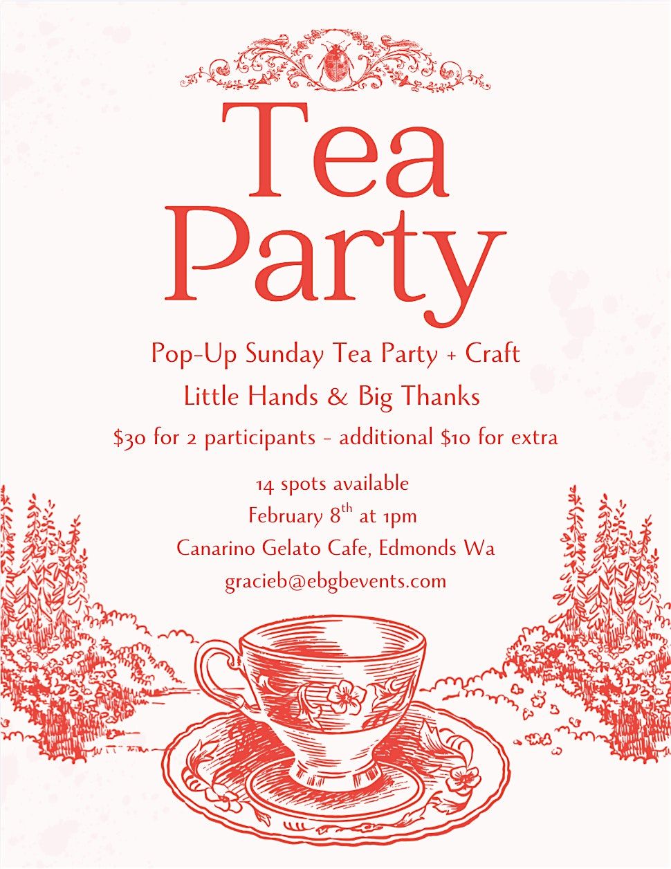 Sunday Pop - Up!!! Tea party at Canarino Gelato! Hosted by EBGB Events, where you will have a tea set, materials for your craft project and a chance to try some homemade gelato! Bring in your kid(s) and dig into that big thank you Valentines card for their teacher. Materials are included, intrsution and the tea/coffee! For 2 partcipents tickets are $30, additional spots will be an extra $10 per person. Family that has 2 kids? Parent and their two kids will be $40 instead of $30. If this includes you, please email me at [email protected] so I can reserve that extra spot, and the extra spots needing to be reserved along with your inital ticket purchase here can be paid at the time of event.