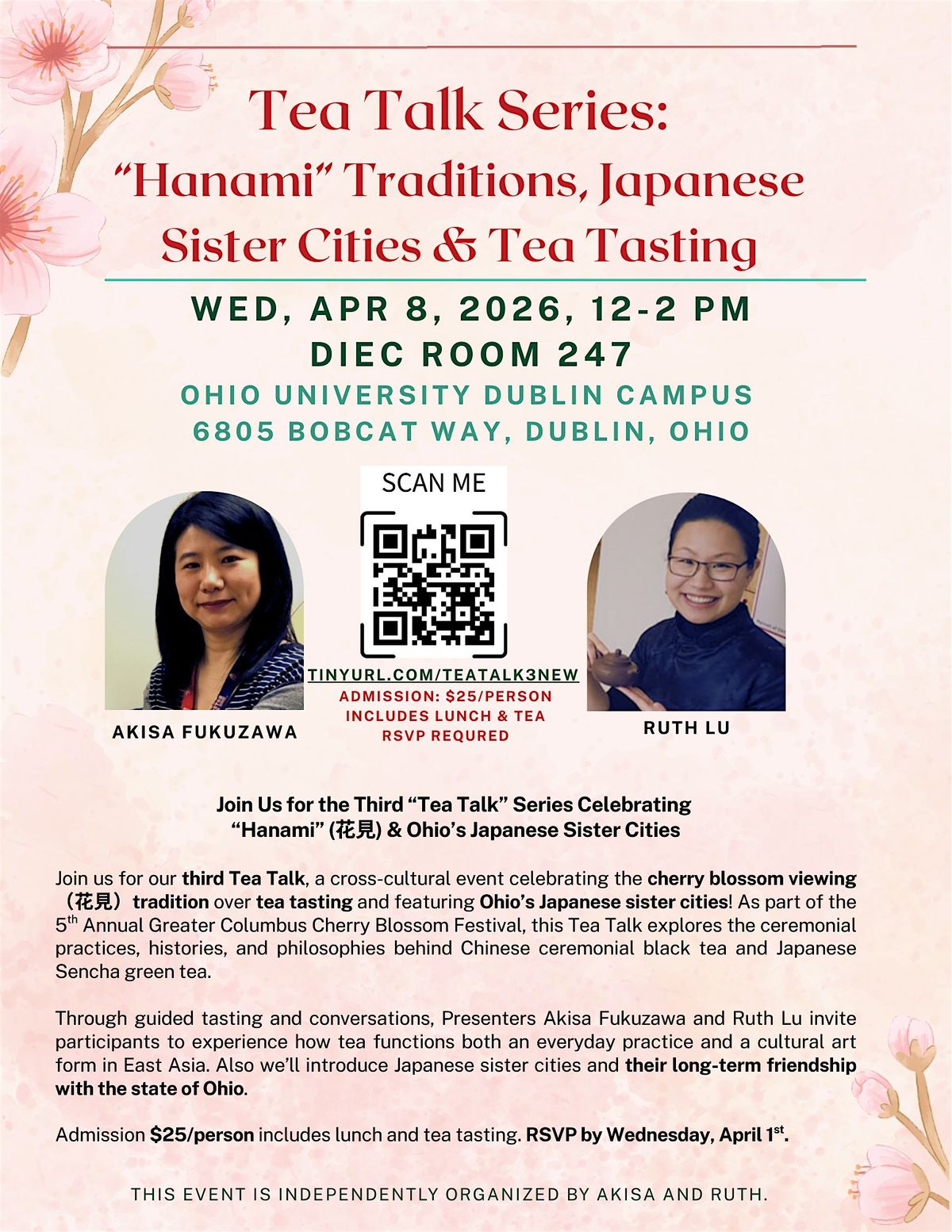 Join us for our third Tea Talk, a cross-cultural event celebrating the cherry blossom viewing (花見)tradition over tea tasting and featuring Ohio’s Japanese sister cities! As part of the 5th Annual Greater Columbus Cherry Blossom Festival, this Tea Talk explores the ceremonial practices, histories, and philosophies behind Chinese ceremonial black tea and Japanese Sencha green tea.