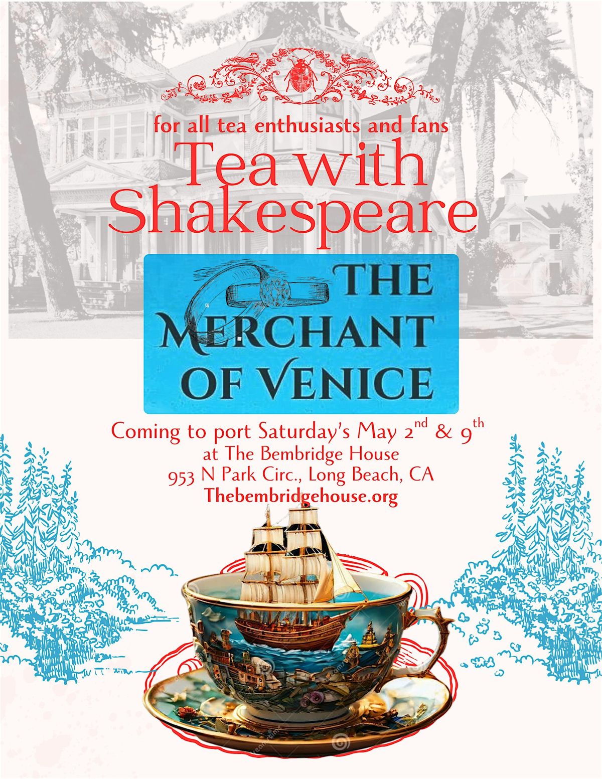 Step inside the historic Bembridge House for a one-of-a-kind afternoon of tea and theatre. Come journey with the Merchant, Antonio and his friend Bassanio as they navigate the seas of Love, Money and Justice!