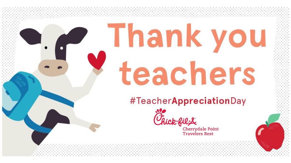 Chick-fil-A Travelers Rest is pleased to honor all local educators, school staff, bus drivers, and administrators by gifting a free Chick-fil-A® Chicken Sandwich OR 8-Count Nugget for Teacher Appreciation Day. A valid school ID is required to receive this free offer. Must be redeemed in the drive-thru, dine-in or carry-out (Not available through the mobile app). Limit one offer per person, per day. Must be present to receive offer. While supplies last. Substitutions will not be allowed.