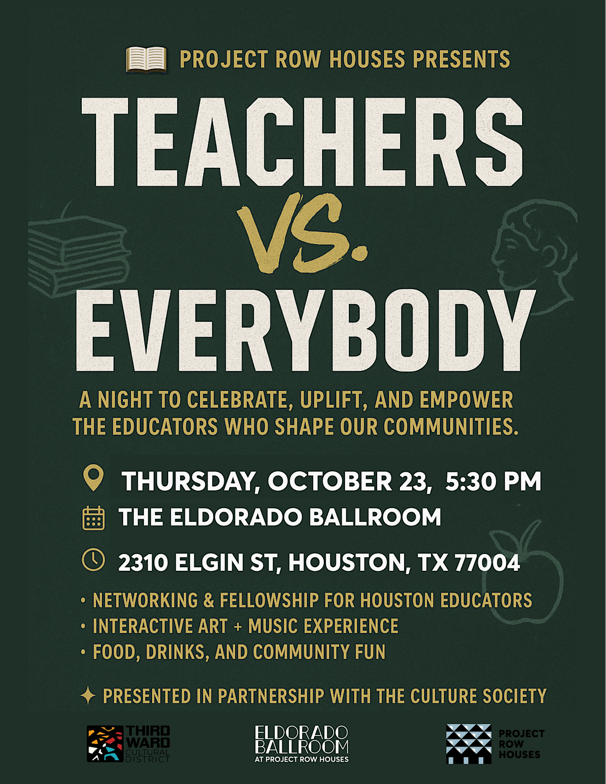 Teachers Vs Everybody is a powerful celebration honoring the resilience, dedication, and impact of educators. Through storytelling, performances, and community conversations, this event shines a light on the real experiences of teachers who show up every day—often against the odds. Join us in the Eldorado Ballroom's Dupree Room from 5:30PM to 7:30PM for an inspiring evening of reflection, recognition, and connection as we uplift those shaping the future, one student at a time.