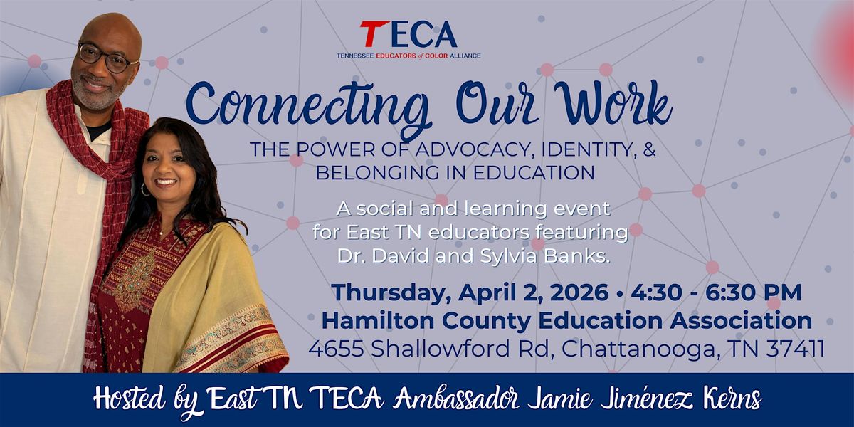 The Tennessee Educators of Color Alliance invites you to join us in Chattanooga! This event will mix networking and learning in an engaging way. Led by guest facilitators, Dr. David and Sylvia Banks, the event will guide educators in connecting who they are as individuals to what they do professionally, and how to build sustainable networks. The evening will include information about TECA, share educator resources, and provide networking opportunities for educators of color across Hamilton County.