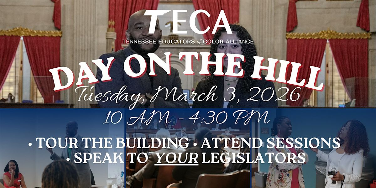 The Tennessee Educators of Color Alliance is proud to host our fourth annual TECA Day On The Hill. The agenda will include visits with legislators and policymakers, attending committee meetings, and a tour of the building. A late lunch will be provided.