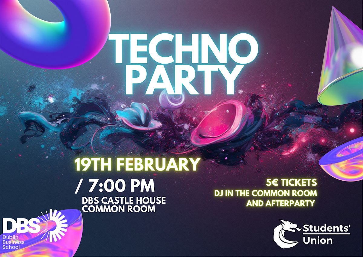 Welcome to our Techno Party at Dublin Business School! Get ready to dance the night away on February 19, 2026 at 7 PM. Join us in the Common Room for an electrifying evening filled with pulsating beats and good vibes. Don't miss out on this epic event that will surely leave you wanting more. We'll move to a different venue for the afterparty, See you there! Glowing sticks, free drinks, DJ and lots of fun included!🕺🎶