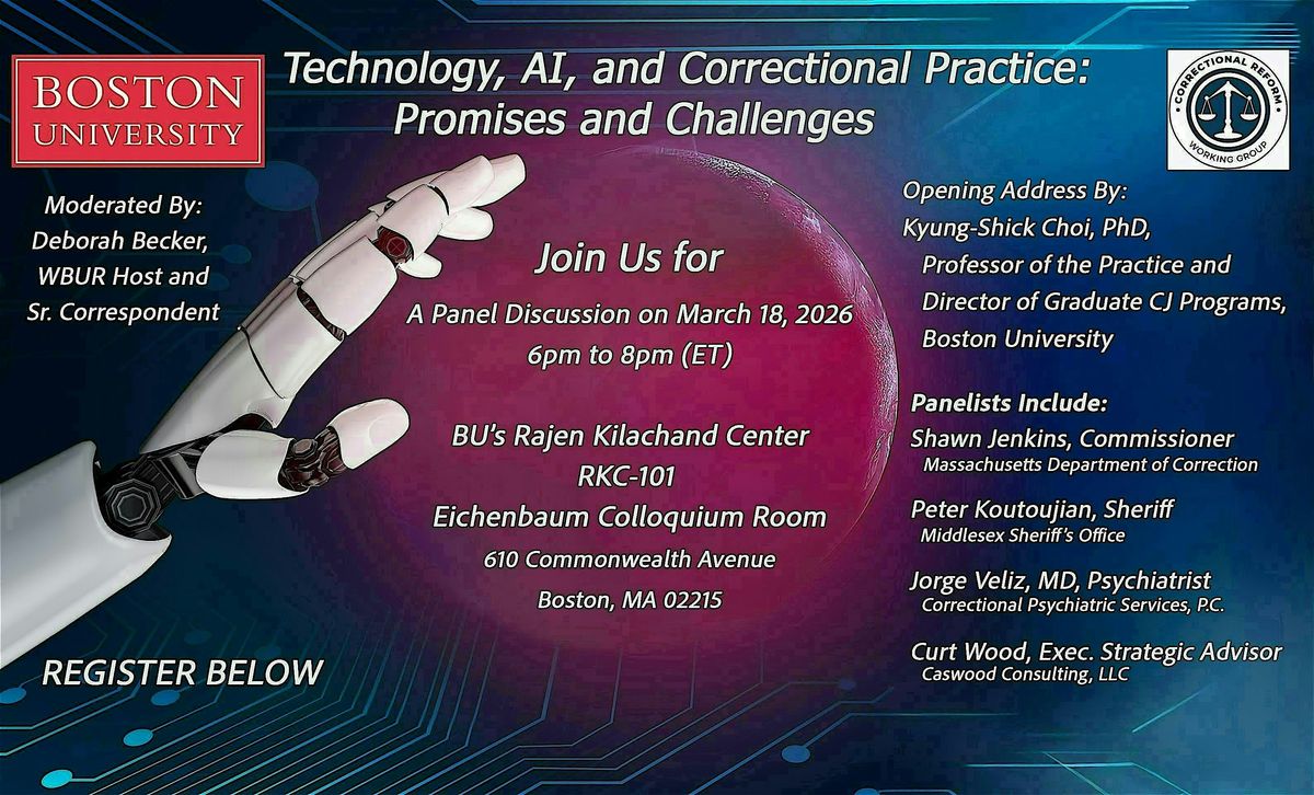 Moderated by WBUR’s Deborah Becker, the panel will focus on the impact that AI and emerging technologies have in corrections. Join us at BU's Rajen Kilachand Center (610 Commonwealth Ave, Boston, MA) for an evening of discussion and connection. Whether you're a seasoned professional or just starting out, this event is perfect for anyone interested in learning more about AI and emerging technologies and how they are transforming corrections.
