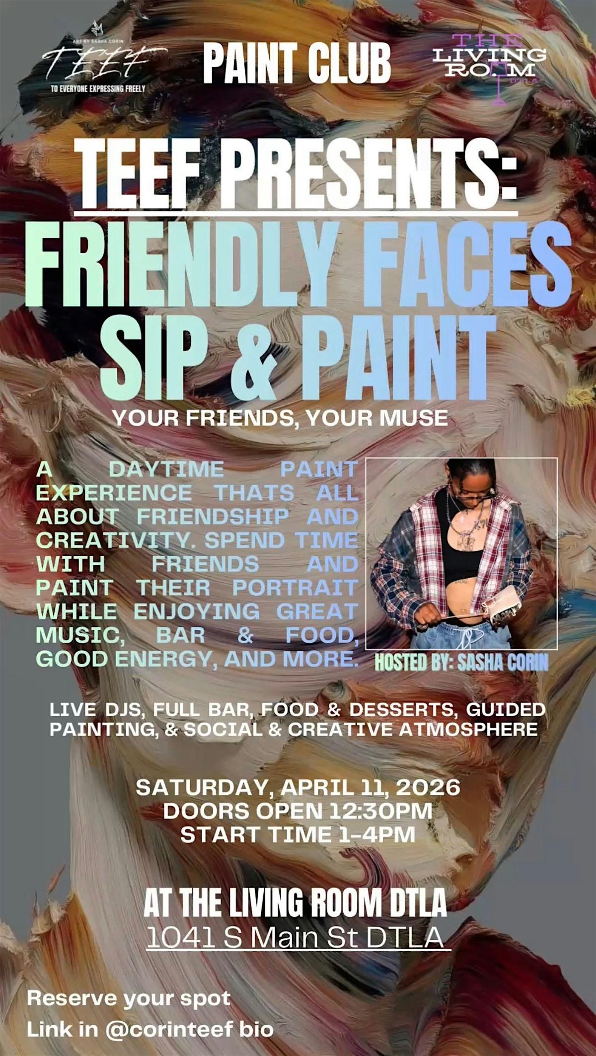 Along with the painting experience, guest will have access to a full bar, food, desserts, and specialty cocktails exclusive to The Living Room. By the end of the event, everyone will have the oppurtunity to share and gift their portraits to the people who inspired them. All guest will also have the chance to win a 1 of 1 Painting by TEEF through entering a raffle ticket for $20. Tickets will be available during the event.