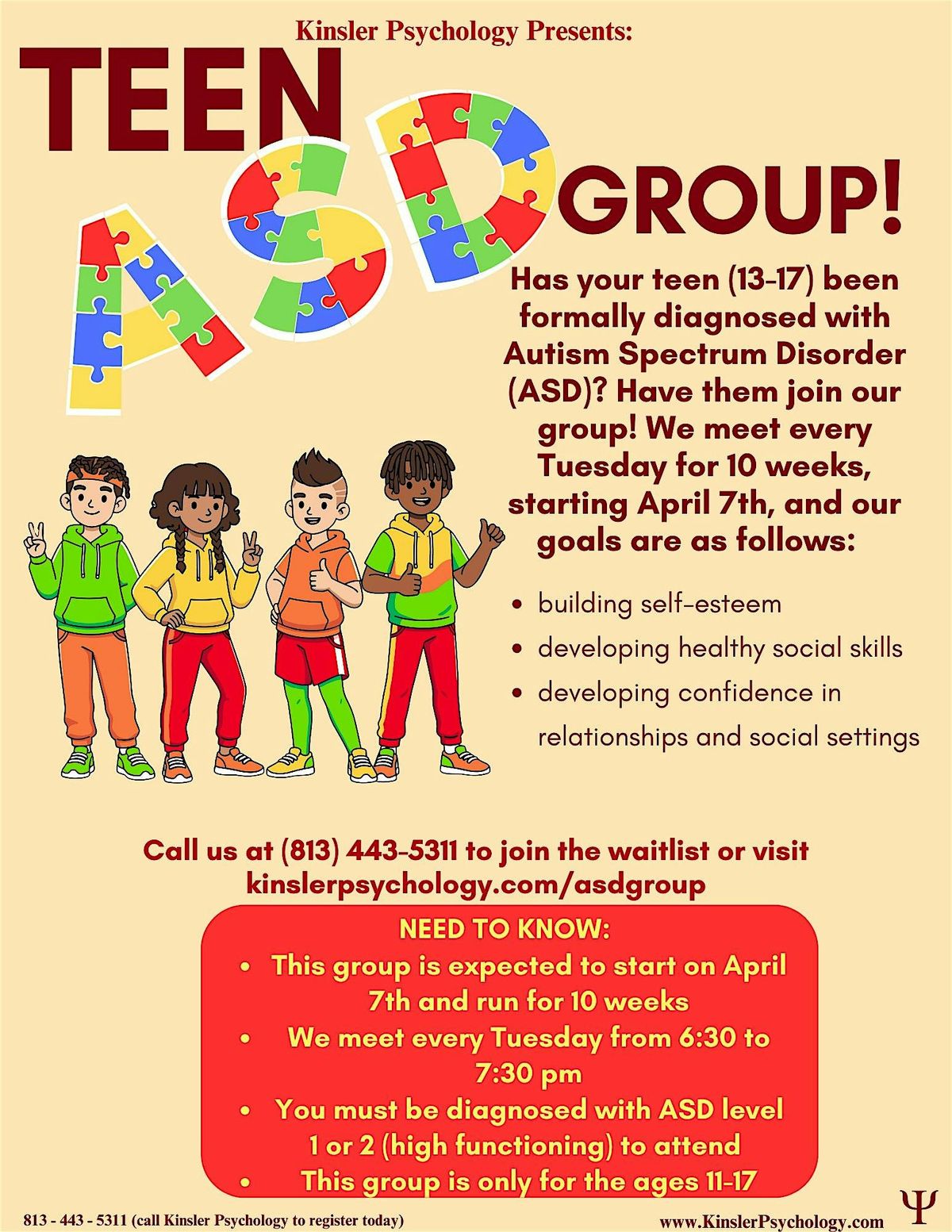 Has your teen (13-17) been formally diagnosed with level 1 or 2 Autism Spectrum Disorder (ASD)? Have them join our group! We meet every Tuesday for 10 weeks, starting April 7th. Sign them up for our Teen ASD Group for some fun face-to-face time. Don’t miss out on this awesome chance to meet others and make new buddies. See you there!