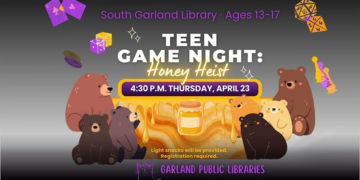 Itβs game night! Tonight weβll be playing Honey Heist, a tabletop role-playing game (TTRPG) where you play as a bear trying to sneak into the annual HoneyCon and steal a lifetime supply of honey without getting caught. No previous TTRPG experience required! Light snacks will be provided. This program is for teens, ages 13-17.